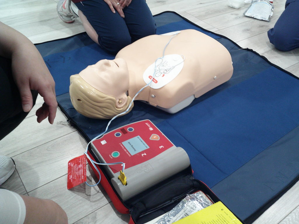 心肺蘇生法・AEDの使い方を教わり、皆さん積極的に取り組まれていました。